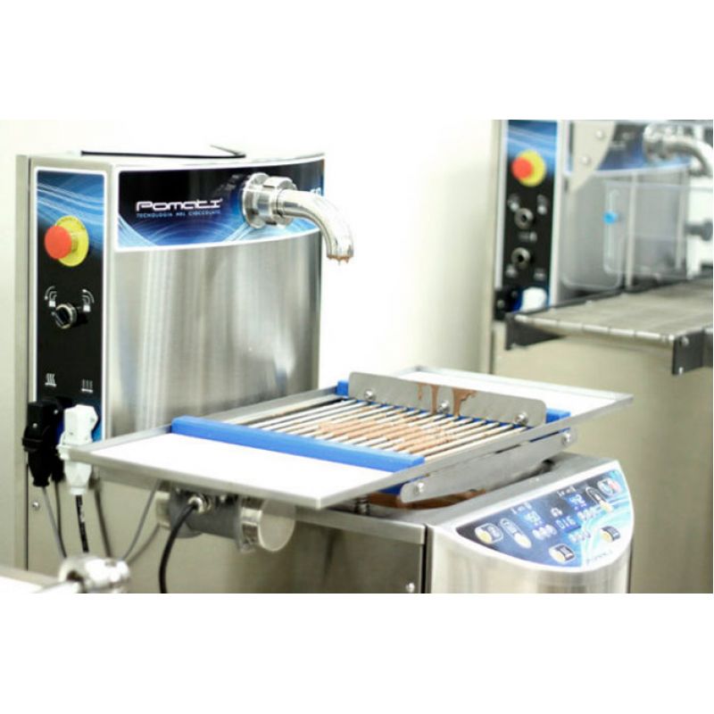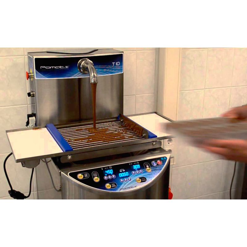 TEMPERING MACHINE Pomati T10 for small-piece production is easy to use. Suitable for melting and tempering all types of chocolate. Tempering takes place in the auger. The best quality of the final product is achieved due to the optimal connection of crystals. Heated chocolate tank with thermostat. Double heating of the recirculation tank and auger, reverse option. Programmable on/off. Drain hole for chocolate. High-precision thermostat that controls the temperature. Cooling device with an air cooling system.