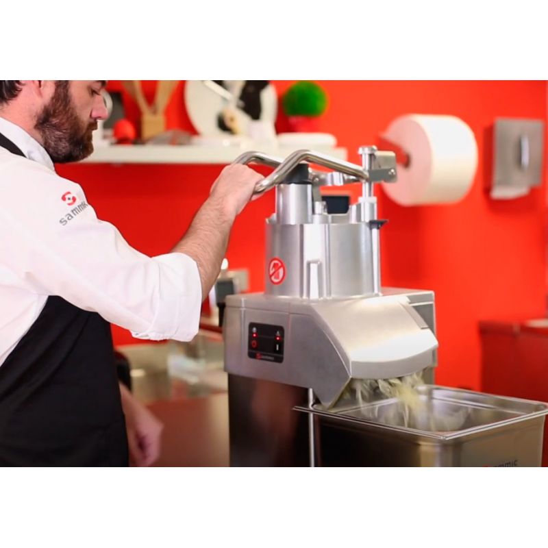 The Spanish vegetable cutter Sammic CA-401 features a side distribution blade, which allows for easy and high-quality processing of bulk products such as cabbage. High ejector blades also increase the processing speed without affecting the quality. The main parts and body are made of food-grade stainless steel. This is a productive and functional model, capable of operating at a single speed and producing up to 650 kg/hour of finished cutting. Equipped with an electronic control panel, it has an ergonomic design.Specification