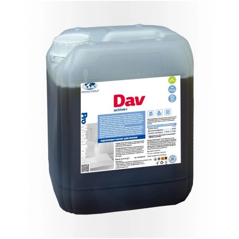Washing booster DAV Active+ PRIMATERRA WS300107 . Enhances the cleaning ability of the main washing agent. Helps remove the main stains. A complex mixture of alkali protects the laundry from graying. Removes natural oils and fats. Terms of use 20 - 40 ml per 5 kg of dry laundry. Packaging, kg 6.5. Cost of washing solution, UAH / l (calculation from a 5 l canister) 2.38-4.77 UAH / wash. Amount of washing solution, l (calculation from a 5 l canister) 125-250 washes.Specification